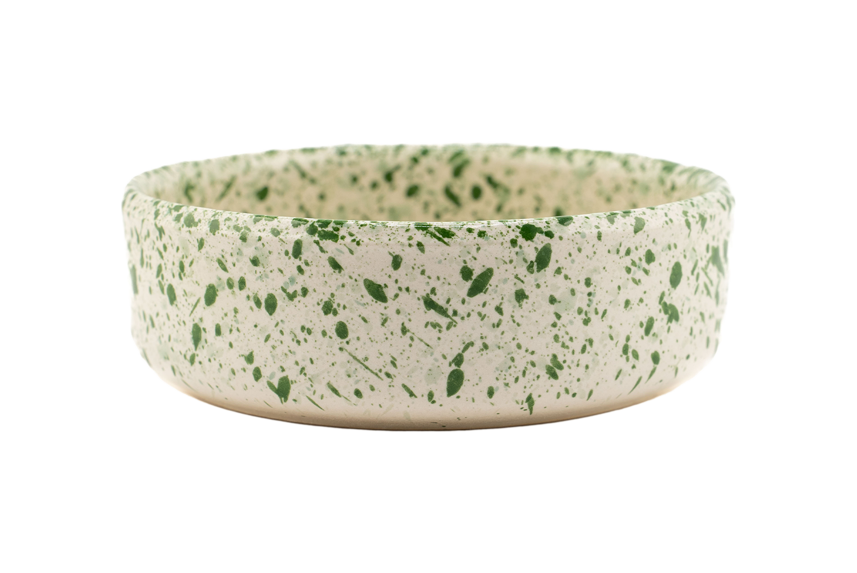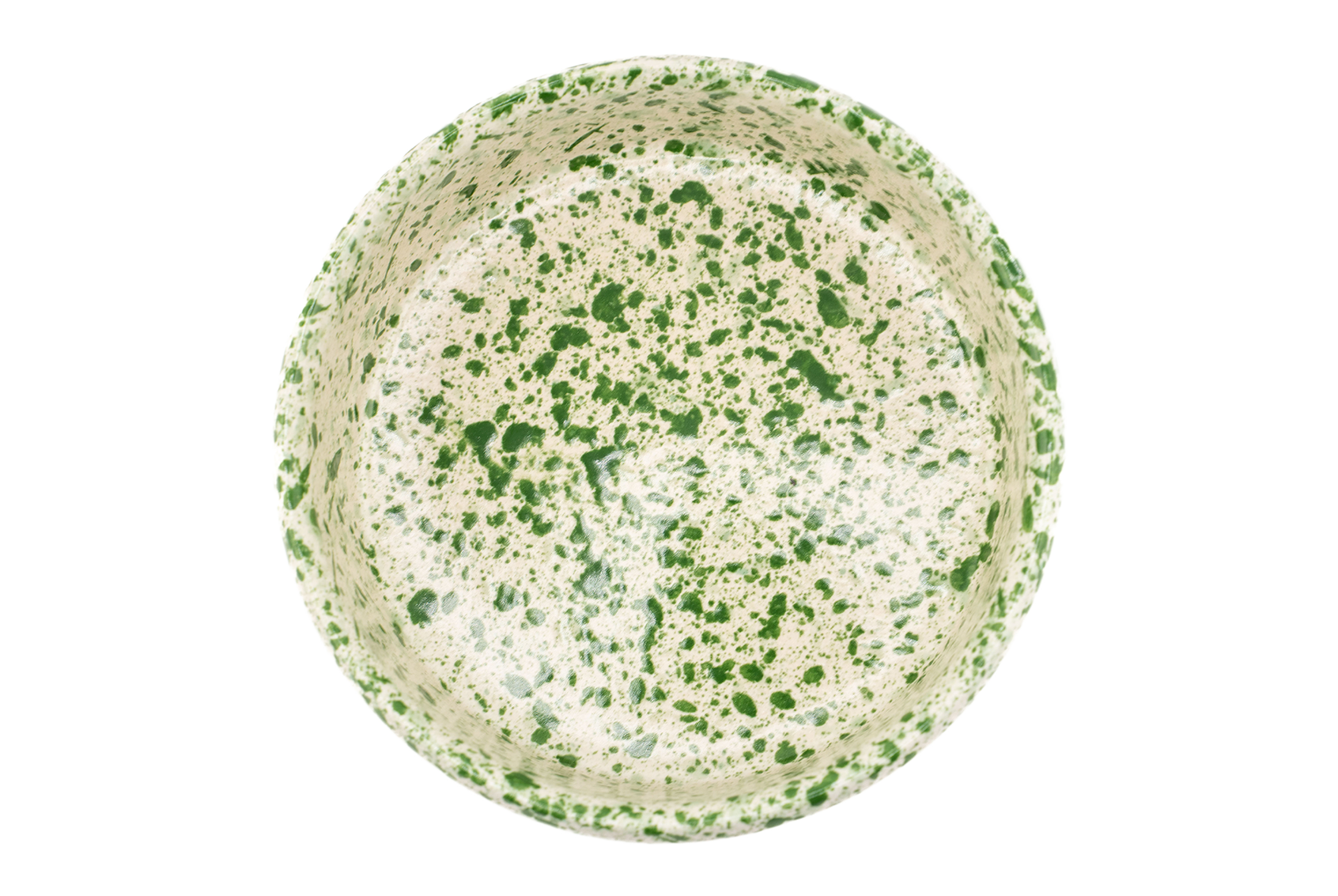 Keraminis dubenėlis, padengtas žaismingais žaliais taškais ant šviesaus pagrindo. Mažas, bet išraiškingas – puikiai tinka alyvuogėms, užtepėlėms ar riešutams. Gali tapti ir smulkių daiktų laikikliu vonioje ar prie lovos – viskas priklauso nuo to, kur jį pasidėsi.
