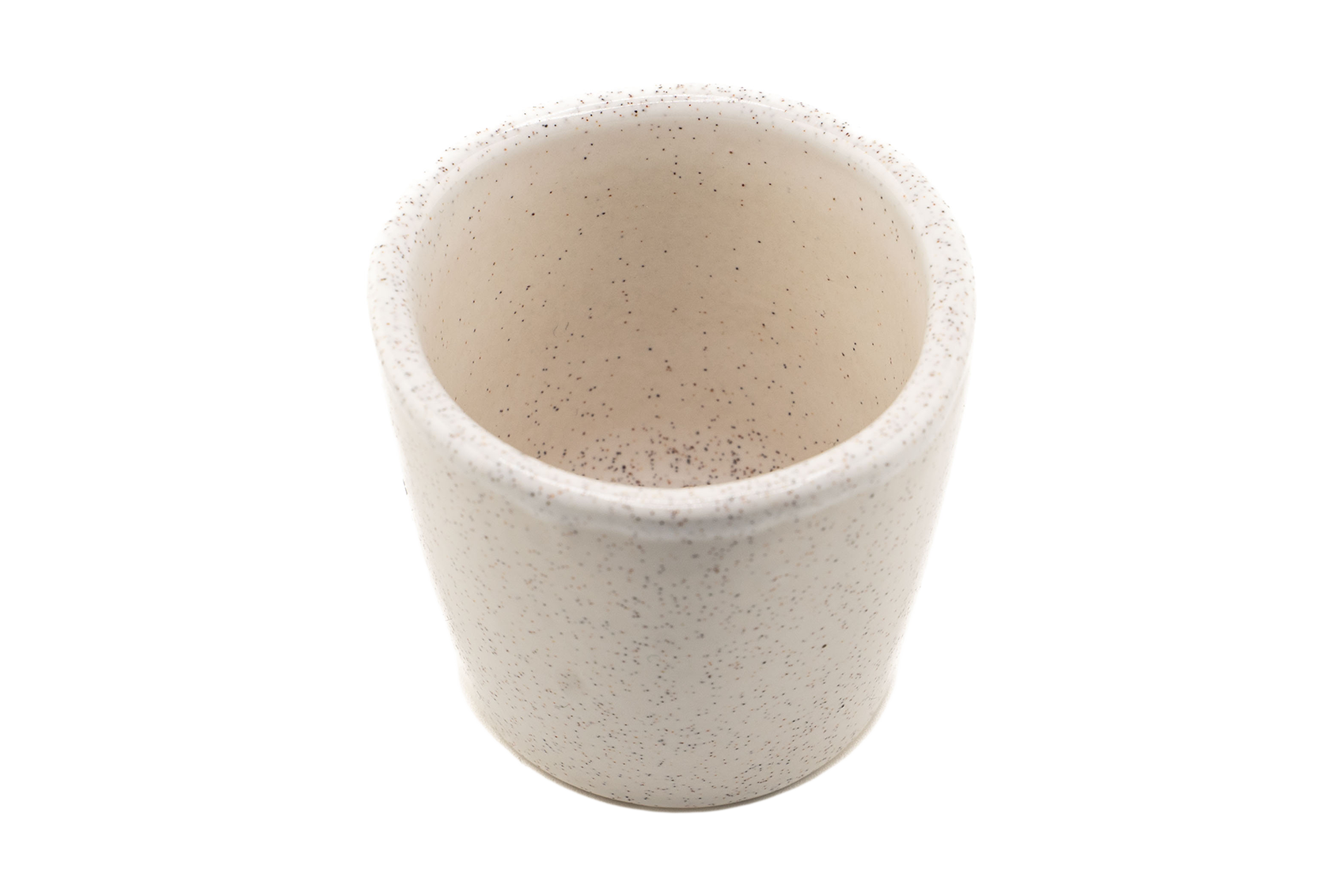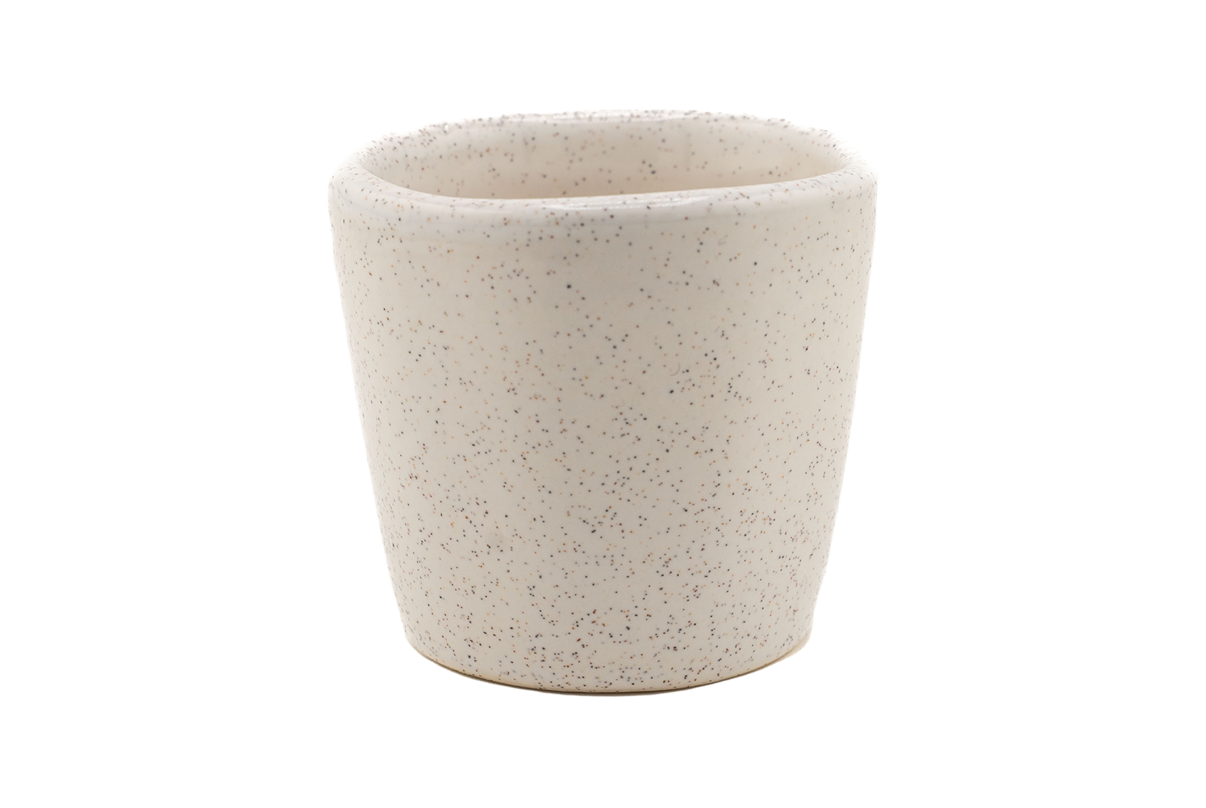 Espresso puodelis su subtiliai taškuota balta glazūra. Iš arti – tarsi sniegas su aguonomis, iš toliau – švari, stilinga forma, kurią norisi paimti į rankas.