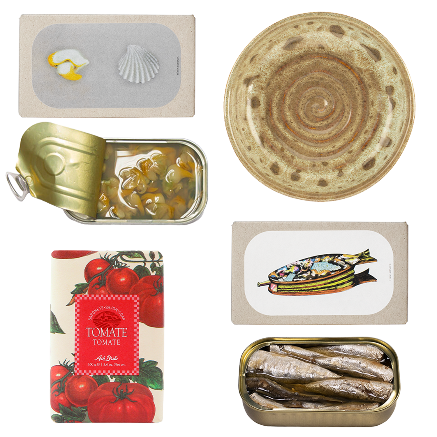Sardinės, moliuskai, pomidorų kvapo muilas ir keramikos detalė - rinkinys, kuris atrodo kaip dovana iš karto. Skoniai iš Portugalijos krantų, netikėtas muilo akcentas ir keramika mažoms akimirkoms. Lengvas pasirinkimas sau - arba jau paruošta dovana tam, kuris vertina mažus, bet apgalvotus derinius.