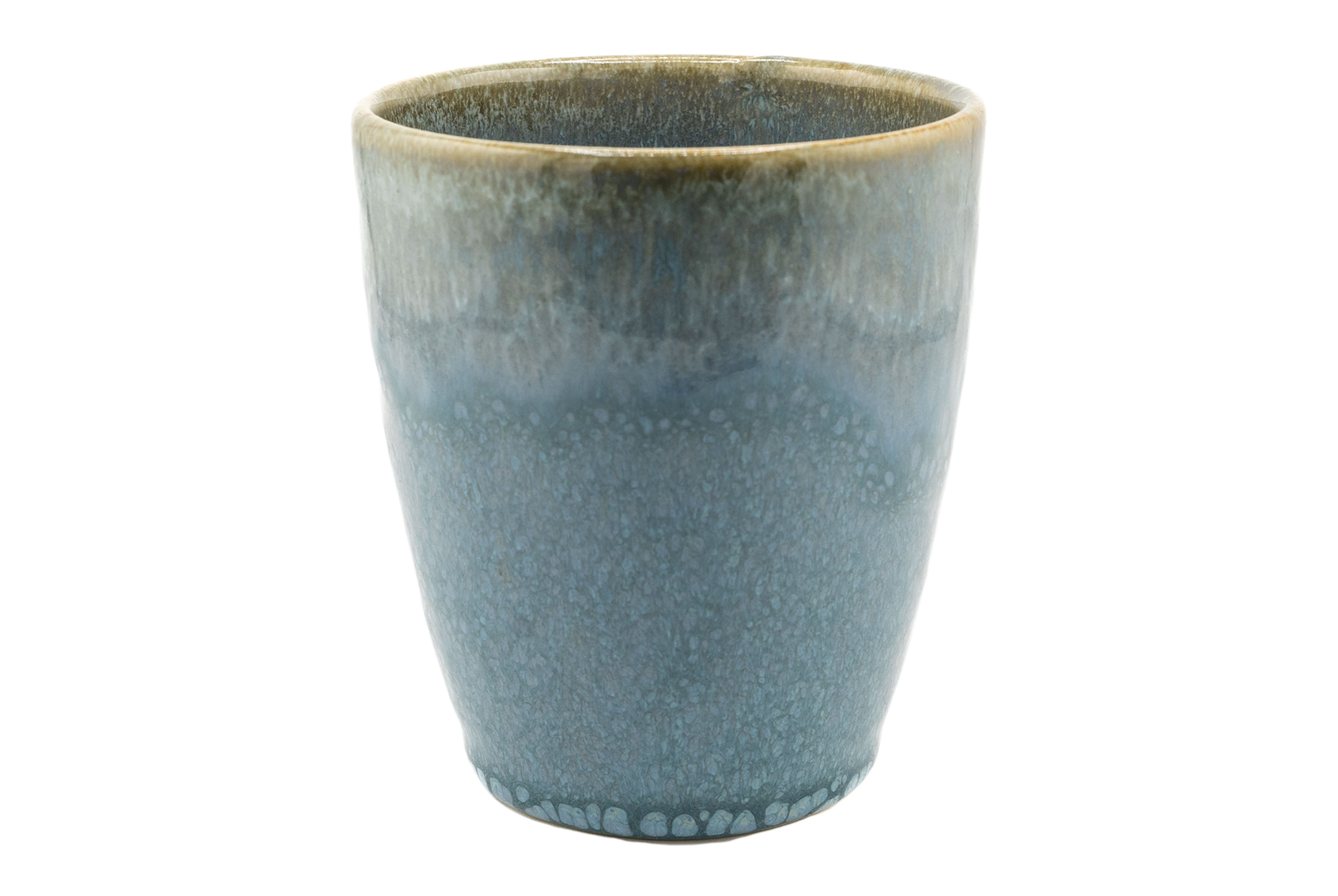 Keraminis puodelis su subtiliu glazūros perėjimu – nuo pilkšvos viršuje iki melsvai žydros apačioje. Malonus rankoje, vizualiai švelnus – kasdieniam gėrimui ar jaukioms akimirkoms, kai norisi lėtumo.